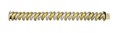 Designed as a line of bi-colour gold half round bombe links, gross weight approximately 90.90 grams, length approximately 200mm, Italian assay and maker's marks. -