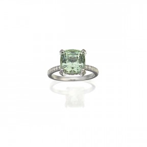 Of cluster design centring a cushion-shaped green tourmaline weighing 4.51 carats within a brilliant-cut diamond surround above similarly set shoulders, the small diamonds together weighing approximately 0.87 carats, mounted in 18ct white gold, size M1/2. -