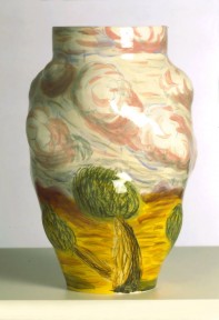 glazed ceramic vase, the bulbous forms depicting clouds and trees in a landscape, artist's signature to base 'David Usher 1998'