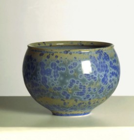 porcellaneous stoneware, with crystalline glaze in shades of blue, green and golden brown, artist's signature inscribed to base