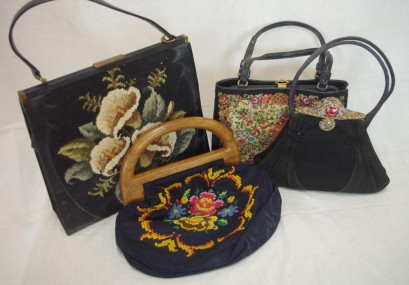 to include a black suede bag with decorative beaded enamel clasp and 3 needle work examples,