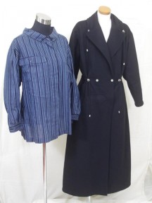 with a toggle drawstring waist and further toggles to collar, fastening with 2 metal buttons and double breasted style to waist. Full length. Together with a Claude Montana striped blue shirt with boat collar, -