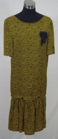 with a low dropped waist, gathered skirt and bright contrasting spotted fabric layer underskirt. -