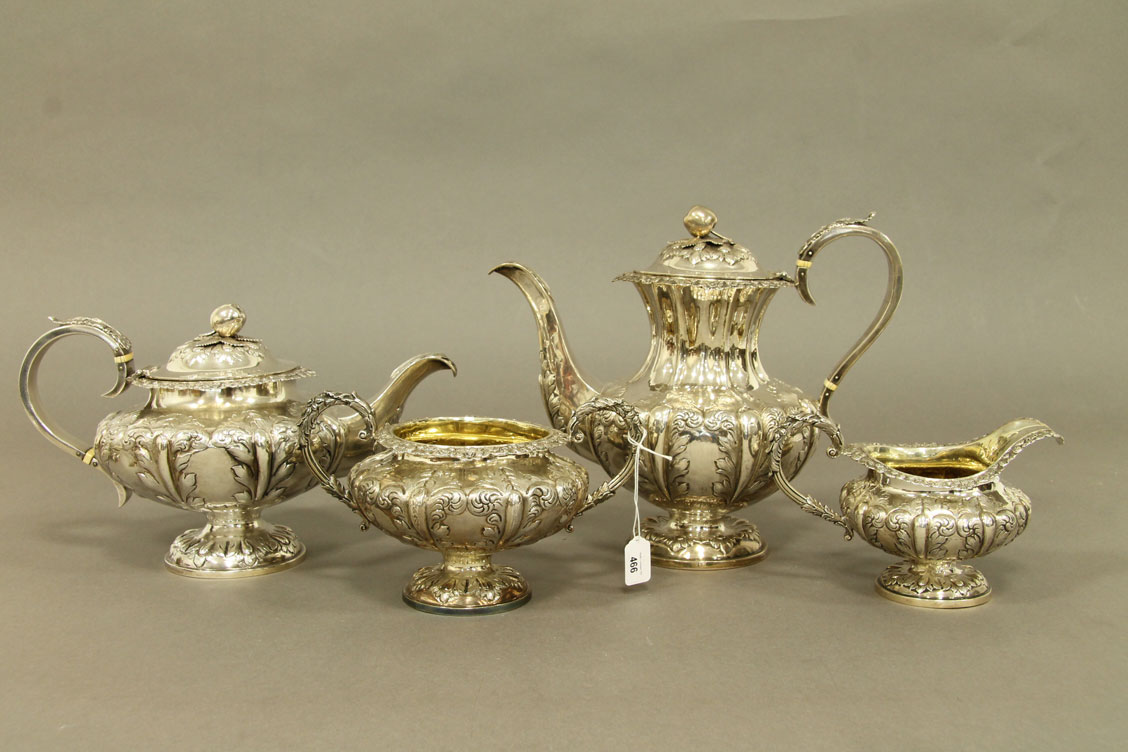 the elaborate four piece set of compressed melon shape with raised leaf and flute decoration. Coffee tea sugar and cream with gilt bowls. J. & A. Savory London 1839. Weight 2.4kgs.