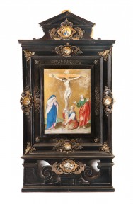 depicting the Crucifixion of Christ, with Mary Magdalene, John the Evangalist, and the Virgin Mary all with him at the foot of the cross, finely painted and mounted in an architectural ebony frame with silvered and brass mounts, with five miniatures depicting God the Father and Matthew, Mark, Luke and John and another with skull and cross bones