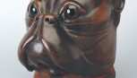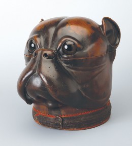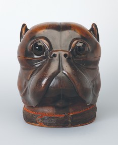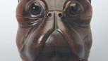 naturalistically modelled as a head of a boxer dog with glass eyes and a leather collar