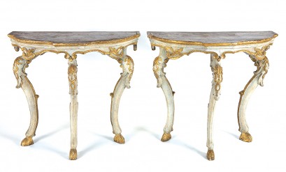 Lot Description:A Pair of Italian Carved And Painted And Parcel-Gilt Demi-Lune Console Tables, 18th Century
