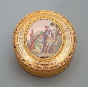 circular, the cover inset with a Swiss enamel plaque depicting Aeneas departing from Dido, the base chased with a flower spray on engine turned ground, the sides also engine turned, gold foliate and scroll borders