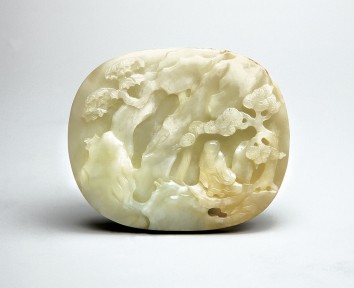 of oval form carved in relief with a sage standing beneath an overhanging pine tree in a rocky landscape, the reverse with a dragon's head hook and button knop carved with a yin yang motif