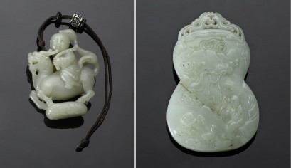 comprising a 'boy' group, carved in the form of a boy riding a kylin, holding a trailing lotus stem in his left hand; and a 'double gourd' pendant, one side carved in low relief with a boy and a duck approaching an old sage holding a fan seated beneath an overhanging pine tree, the reverse with lingzhi scrolls