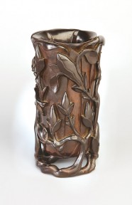 the steep sides carved as overlapping upright petals rising to the lipped rim, springing from a branch coiled to form the base, and with further stems bearing magnolia flowers and leaves carved in deep and undercut relief extending over the exterior