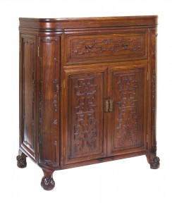 of upright rectangular form, carved on the exterior with angular scrolls in relief, the top and hinged front flap opening to reveal double huanghuali panels covering a fitted bottle container, the front with two doors enclosing a cupboard with one shelf and the sides and rounded corners opening to further cupboards with shelves
