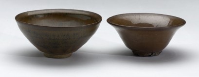 comprising a bowl with deep rounded sides covered overall with a brown streaked black glaze with russet hare's fur streaks extending from below the everted rim; and a conical bowl with everted rim, covered inside and out with a rich russet glaze thinning towards the base to reveal the black glaze beneath, the glazes falling short of the foot to reveal the dark stoneware body of each