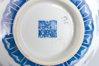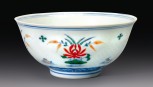 Notes:For the Ming origin of this design compare a doucai bowl, excavated from the Zhengtong stratum of the imperial kiln site at Jingdezhen, included in the exhibition Ceramic Finds from Jingdezhen kilns, the University of Hong Kong, Hong Kong 1992, cat. no. 231; and a Chenghua marked bowl in the Palace Museum, Beijing, illustrated in Yeh Pei-Lang, Gems of the Doucai, Taipei, 1993, pl.43