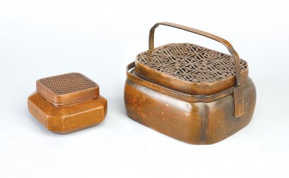 comprising one of shaped rectangular form set on the shoulders with a double swing handle, the flat cover pierced with a wan, ruyihead and florette diaper pattern; and a chamfered square-form hand warmer, the flat cover pierced with a florette diaper pattern, the base of each with impressed marks (4)