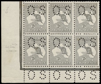 No Monogram corner block of 6 from the left pane, perforated Small OS and showing the variety at L55 "Retouched left frame and shading N.W. of map." Lightly mounted in the bottom margin only; a couple of minor gum tones, however an exceedingly rare piece. BW:5(1)z+ - ($5000) -