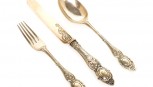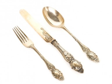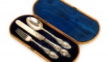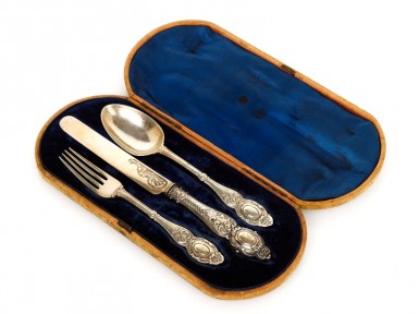 comprising knife, fork and spoon in original case, bearing marks for Francis Higgins, London 1866