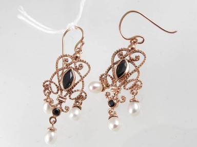 Lot #187 - A Pair of Onyx, Pearl And 9ct Rose Gold Drop Earrings
