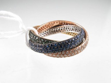 set with diamonds, sapphires and green garnets; 18ct gold. -