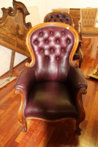 in later buttoned maroon leather. -