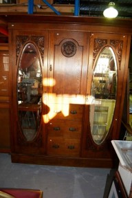 2 doors with oval full length mirrors, 1 slightly AF, centre section with panelled door over 3 drawers, fitted interior, circa 1910