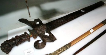 wavy steel blade with carved rosewood grip, and inlaid stones, carved rosewood scabbard -