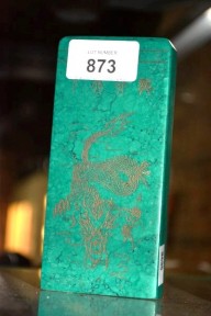 Lot Description:Chinese turquoise ink stone with engraved dragon detail and calligraphy