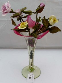 Lot #161 - Pink edged glass vase with porcelain flowers