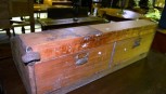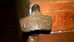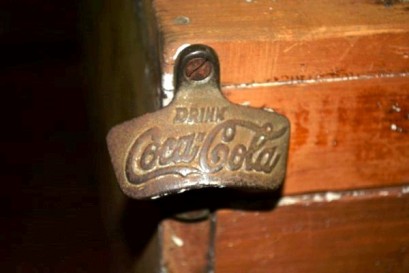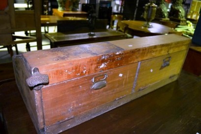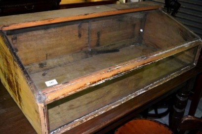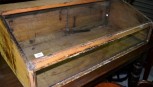 slope front with insect glass, stripped timber frame, 2 x hinged drop drawers to rear, note: fitted with an original 'Drink Coca Cola' cast iron bottle opener to rear -