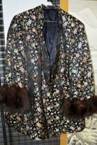 with design of wine cups & teapots etc on a black ground with fur cuffs -