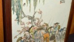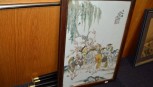 with calligraphy insignature, timber framed, porcelain size is 46 x 31.5cm, note: at some point has been converted into a table, legs available -