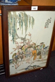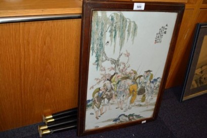 Lot #508 - An old Chinese porcelain plaque with various figures standing under a tree