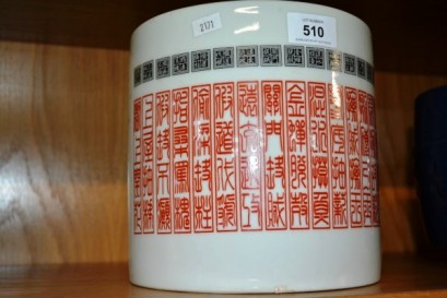 Lot #510 - Chinese cylindrical brush pot with red & black calligraphy