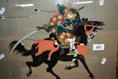 Lot Description:Oriental painting on silk of a warrior on horse back