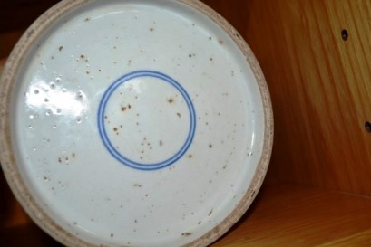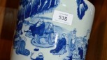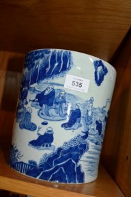 blue & white glaze with various seated figures and other figures in a river, 20cm h. x 19cm. d, 2 blue rings to underside