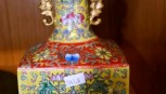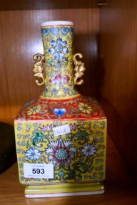 Chinese pottery vase, floral design, on a yellow ground, twin gilded handles, 4 blue character marks to base, 23cm h. -
