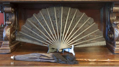 Lot Description:A Victorian ivory mounted ladies silk parasol and an ebonised lacework fan