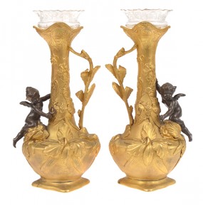 Lot Description:A Pair of Gilt Bronze Art Nouveau Vases With Etched Glass Inserts Late 19th Century