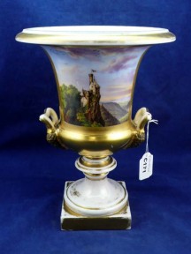 Lot Description:Antique Continental porcelain campana shape vase with painting of a castle