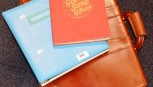 plus a red stamp album with world stamps, together with a brown leather briefcase -