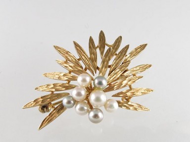 14k gold and leaf and berry brooch with eight Akoya cultured pearls of various colours. Wt 7g. -