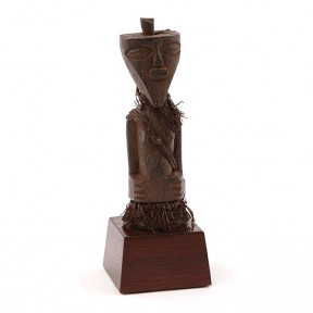 Fine wooden figure with arms resting to torso. Triangular shaped head with raised coffee bean shaped eyes, body adorned with fibre decoration.