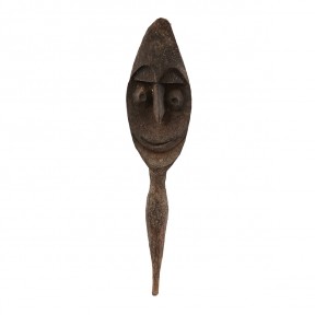 Stone carved with ovoid head and carved raised features, leading to a bulbous tapering body, encrusted blackened patina.