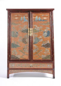 Lot Description:A Chinese lacquered and painted two-door cabinet, decorated throughout with oriental scenes, late 20th century