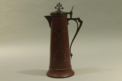 with hinged lid. The handle, thumb catch and finial in brass, and the copper tapered body with a relief tendril vine and honesty plant motif. European bird mark 106.