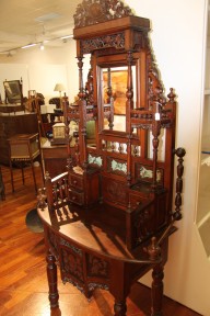 with mirrored back, galleried shelves and four small drawers extensively carved.