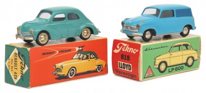 sea green, metal hubs, plastic spoked wheels; and 818 Lloyd LKS 600, blue, 'A. Hansen' decal to rear, metal hubs, both in illustrated boxes (E boxes G-E) (2) -