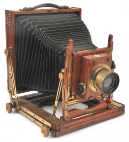 comprising half-plate, compact, double-extension mahogany and brass trim field camera; with Thornton Pickard Rectoplanar f/8 brass bound lens in T-P Roller blind shutter; 3 x double dark slides; black cloth; tripod; and separate wide roller blind shutter, Condition: 5-6 (7) -