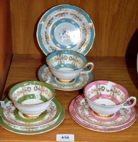 each with a floral pattern in gilt highlights, in different shades of green, blue and pink -