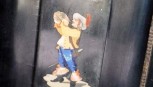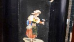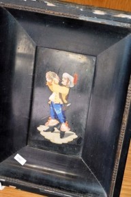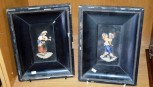 each depicting a male and female, a barmaid with wine jug and glass and the other is a cavalier with a wine bottle, each in ebonised timber frame, one bearing paper label to rear from 'H.Credgington & Co. catholic art gallery, 344a Little Collins St. Melbourne' each panel is 17.5x9.5cm, note: losses, chips etc to frame -